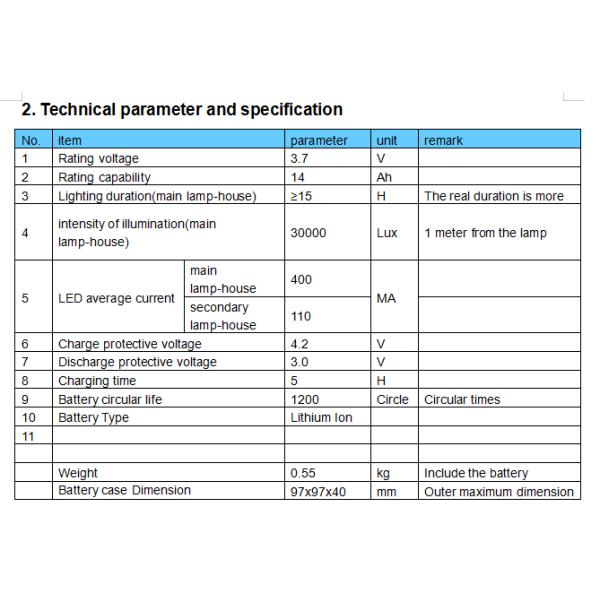 Contained in a sealed battery case, the product has a short-circuit protection, LED light head lamp and anti-static housing which makes it explosion proof, waterproof and dust-proof. The miner's lamp is ATEX Certified for use in explosive atmospheres such as coal mines.
